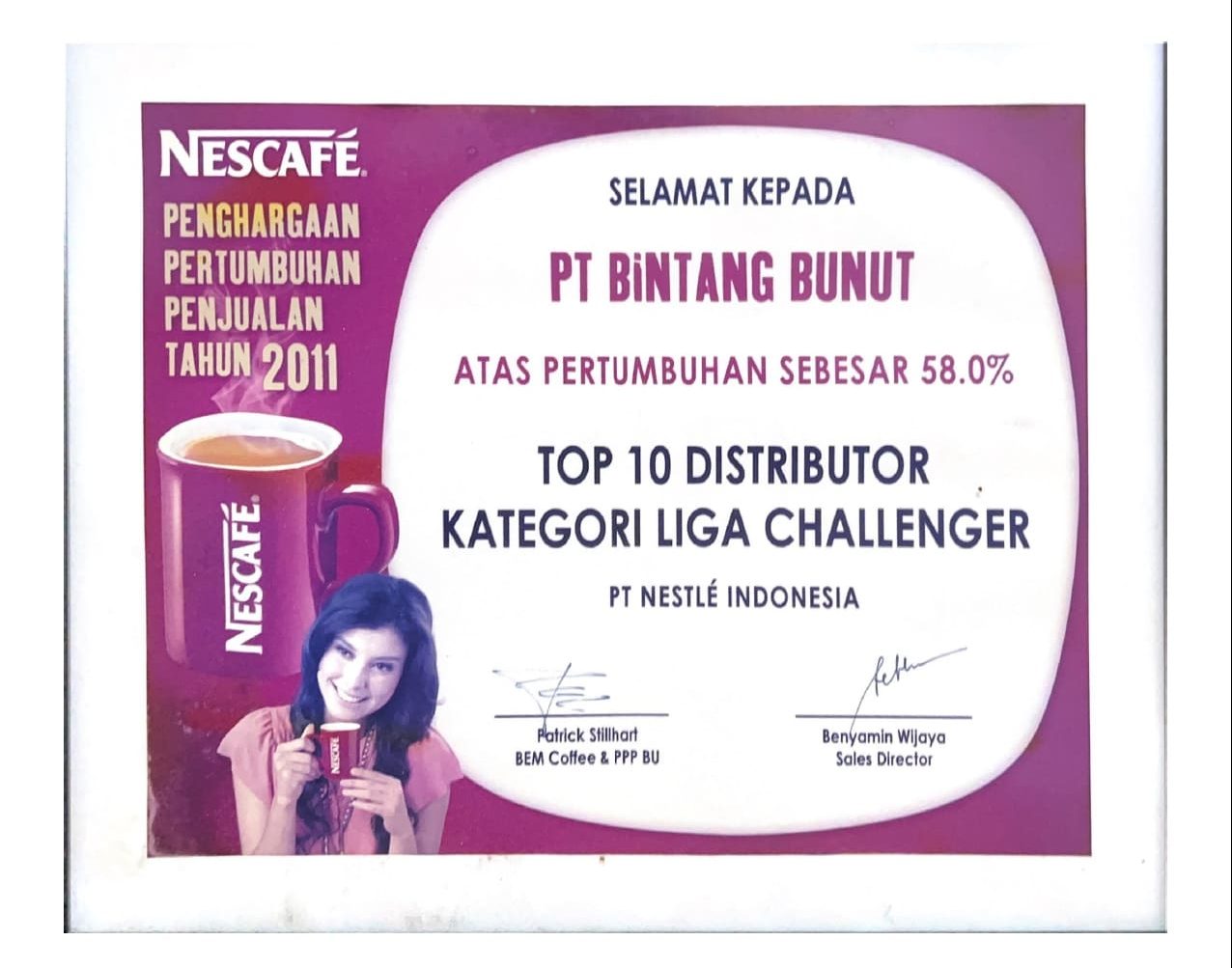 PT. Bintang Bunut telah menerima berbagai piagam penghargaan dari Nestle dan Unilever sebagai bentuk apresiasi atas dedikasi dan kinerja unggul kami dalam mendistribusikan produk mereka ke seluruh pelosok Kalimantan dan Jabodetabek. Penghargaan ini menjadi bukti komitmen kami untuk memberikan layanan terbaik dan menjangkau lebih banyak konsumen.